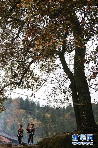 1月13日,在广西融水苗族自治县杆洞乡乌英屯,小朋友在练习吹芦笙。新华社记者 陈君清 摄