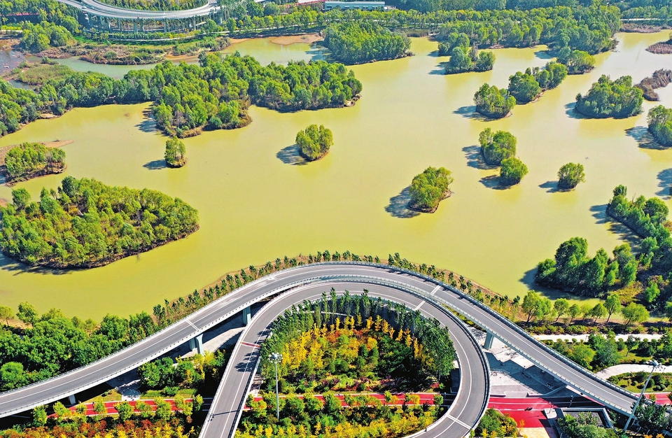10月10日,俯瞰汾河公园摄乐桥下,汾河水碧波荡漾,河岸层林尽染。步入汾河公园,河水在阳光下闪烁着、流淌着,沼泽地里水草摇曳,野花与周边的山脉相映成趣,恰似一幅动人的写意山水画。(记者刘通摄)