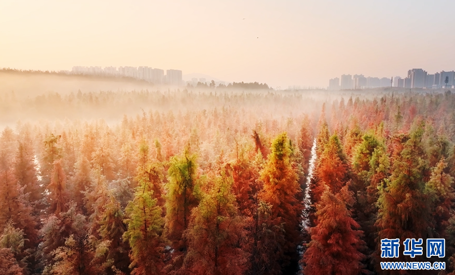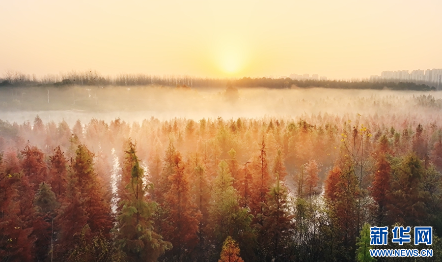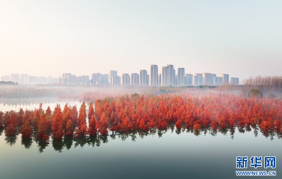近日,在安徽省合肥市董铺水库,大片红杉林迎来最佳观赏期。从空中俯瞰,红色的树影倒映在绿水之上,让人陶醉。新华网发(江河 摄)