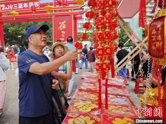 1月27日,“在三亚 过大年”2024三亚年货节主会场开幕,喜庆热闹的年味氛围吸引众多市民游客,图为民众选购年货。张月和 摄