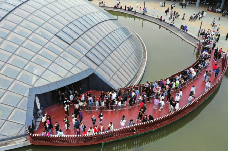 游客排队进入太原植物园室内馆。