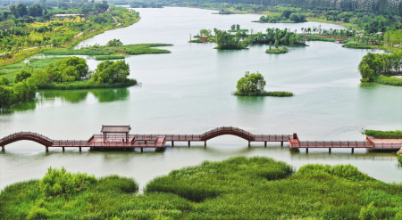 6月29日拍摄的太原汾河景区四期,郁郁葱葱的植被、清澈的河水、自由嬉戏的飞鸟,共同构成了一幅生机勃勃的生态画卷。盛夏时节,太原汾河景区四期空气清新,花香四溢,吸引众多市民前来游玩。