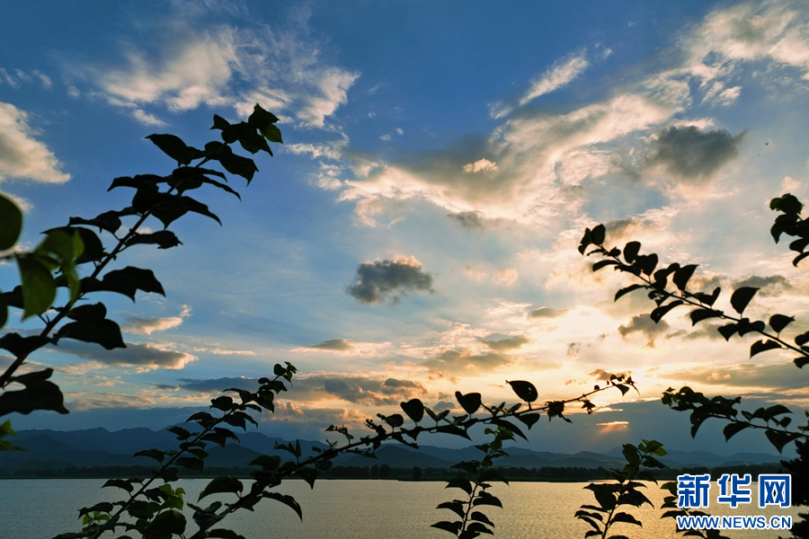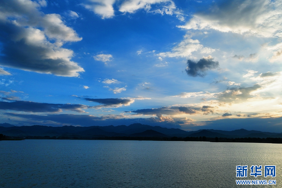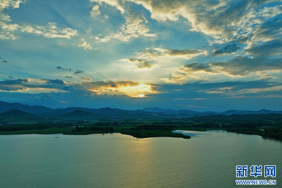 7月27日,河南省南阳市镇平县上空朝霞满天,天空、云朵、群山、水面在霞光的映衬下,宛若一个巨大的调色盘,美如画卷。新华网发(图文/时君洋)