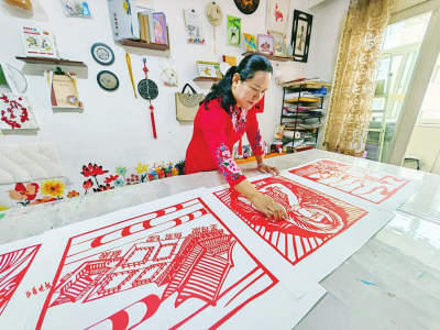 8月31日上午9时许,正值周末假期,位于太原市迎泽区的一处安静的老式单元楼内,太原市非遗任氏民俗剪纸的第四代传承人任丽红,正在自己的工作室,认真而忘我地研究着山西古建的基本结构与建筑风格。而在她的旁边,则放着早已准备好的刻刀、大红宣纸、小剪刀、各色养料、毛笔等制作剪纸所需的工具和材料。