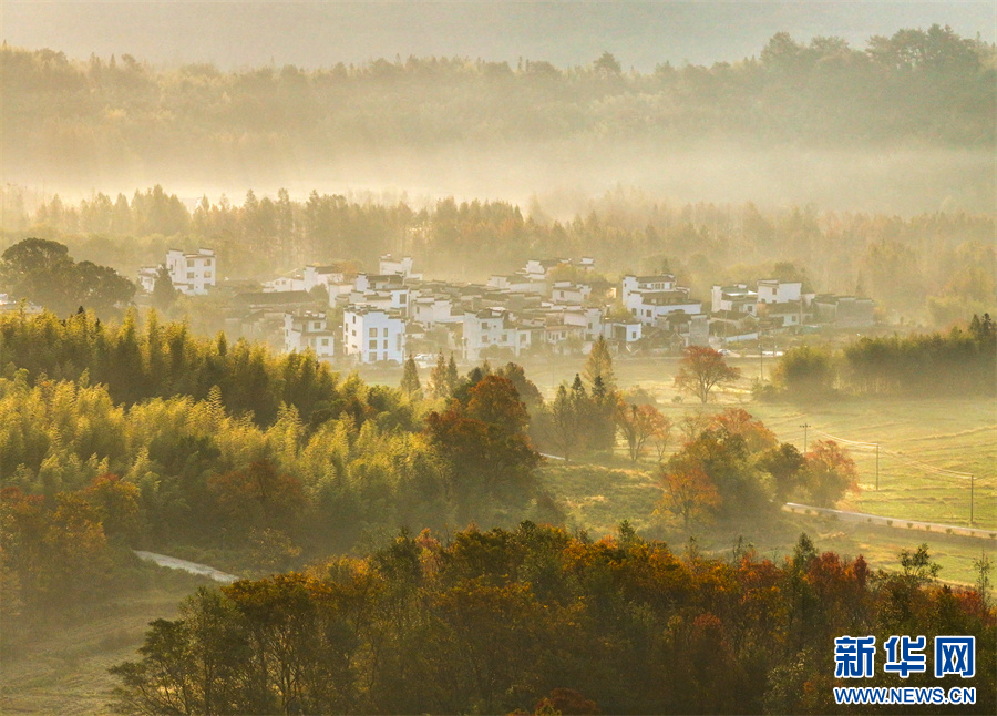 初冬的早晨,安徽省黄山市黟县卢村云雾缭绕,色彩斑斓的乌桕树叶与鳞次栉比的徽派民居交相辉映,景色旖旎,令人流连忘返。新华网发(施亚磊 摄)