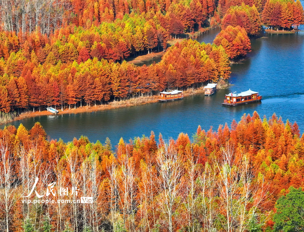 初冬时节,江苏省淮安市盱眙县天泉湖色彩斑斓,落羽杉林枝叶飘红,与碧水相映成趣,构成一幅美丽的冬日生态画卷。方东旭摄(人民图片网)