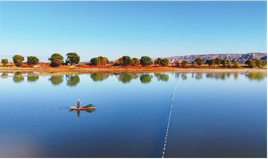 11月29日,万荣县汾河滩,渔民划着小船在鱼塘里布网劳作。一人一舟,一山一水,呈现出一幅人与自然和谐共生的美丽画卷。