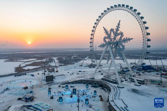 这是12月9日拍摄的哈尔滨冰雪大世界雪花摩天轮附近的施工场景(无人机照片)。