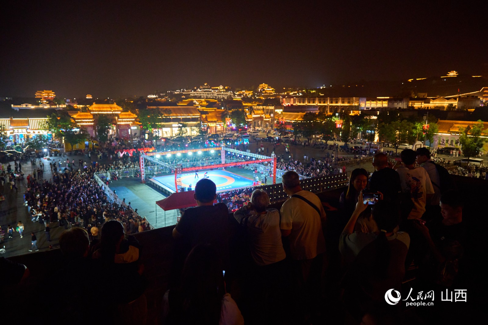 游客们在忻州古城城墙上观看对抗挠羊赛。人民网 张超宁摄