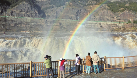 12月3日,游客在吉县黄河壶口瀑布欣赏“双彩虹”景观。初冬时节,受上游水库调节放水影响,黄河壶口瀑布水量增大,飞溅的水雾经阳光照射,形成季节特有的“双彩虹”景观,吸引了众多游客驻足观赏。