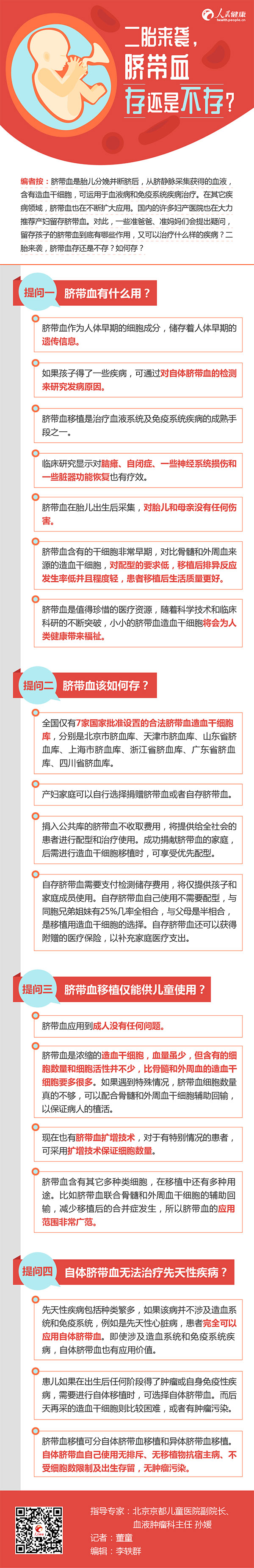 编者按:脐带血是胎儿分娩并断脐后,从脐静脉采集获得的血液,含有造血干细胞,可运用于血液病和免疫系统疾病治疗。在其它疾病领域,脐带血也在不断扩大应用。国内的许多妇产医院也在大力推荐产妇留存脐带血。对此,一些准爸爸、准妈妈们会提出疑问,留存孩子的脐带血到底有哪些作用,又可以治疗什么样的疾病?二胎来袭,脐带血存还是不存?如何存?
