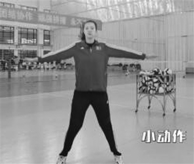 ● 轻跳起来,双脚向两侧张开,与此同时,双臂伸直,在身体两侧向上摆动,在头顶上方交汇或击掌;