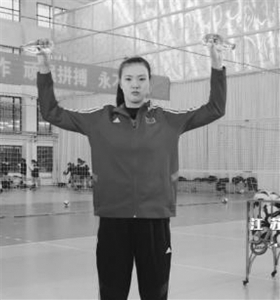 ●两臂伸直,双手虎口相对,掌心向后握持重物(矿泉水瓶)放在身体两侧;
