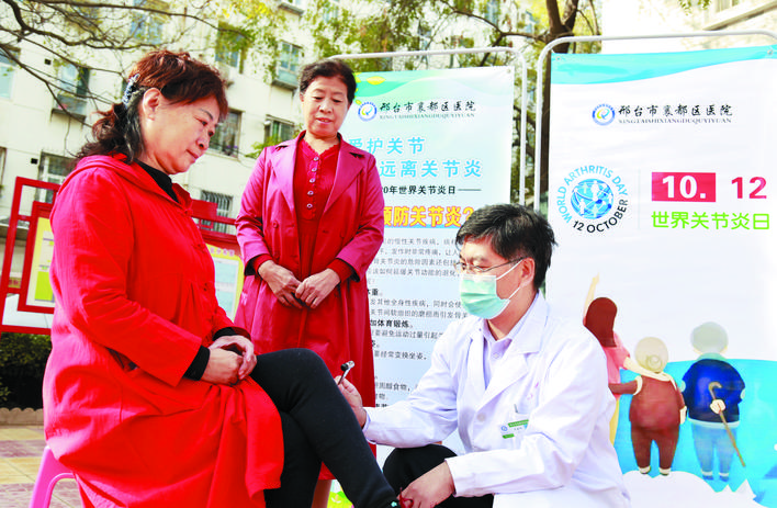 10月12日是世界关节炎日,河北省邢台市襄都区医院医护人员走进社区,开展“爱护关节,远离关节炎”义诊活动,为居民解答关节疾病方面问题,向居民普及关节健康知识。 新华社发(张驰 摄)