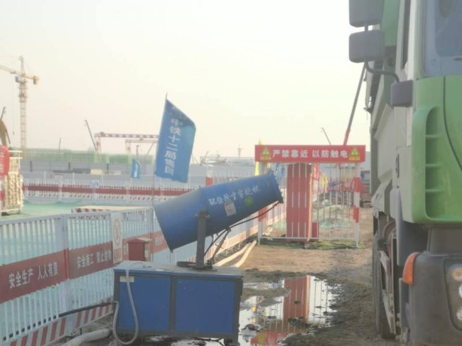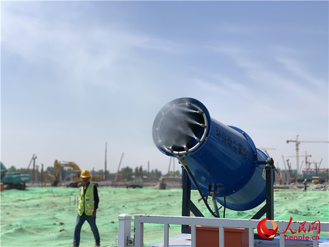 环保除尘雾炮机在施工现场作业。人民网5月7日摄