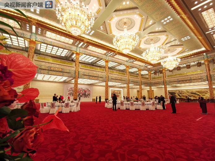 △金色大厅位于人民大会堂三层,面积约2200平方米。大厅有20根朱红漆金巨柱,5盏金光闪闪的巨型吊灯从顶部垂下。(央视记者张宇拍摄)