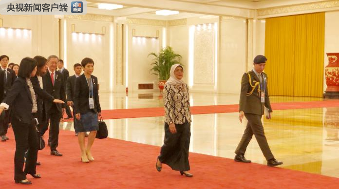 △前来与习近平会面的新加坡总统哈莉玛。(央视记者许永松拍摄)