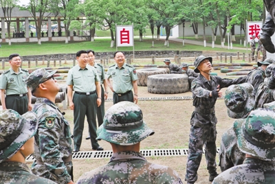 学院训练场上,学员们生龙活虎、喊声震天,一派实战化练兵景象。习近平走到障碍训练场旁,察看学员进行障碍训练情况。极限训练对于锤炼学员体能极限、意志极限、心理极限,提高战场适应能力很有意义。习近平步行进入极限训练场,详细了解有关训练设施和训练情况。学员们进行了阻绝墙跳水、翻越懒人梯、跨越步步高、翻越高墙、攀爬云梯、攀越高空荡木桥、扛圆木等训练。看到学员们摸爬滚打一身泥水,迎着障碍一往无前,习近平很高兴。