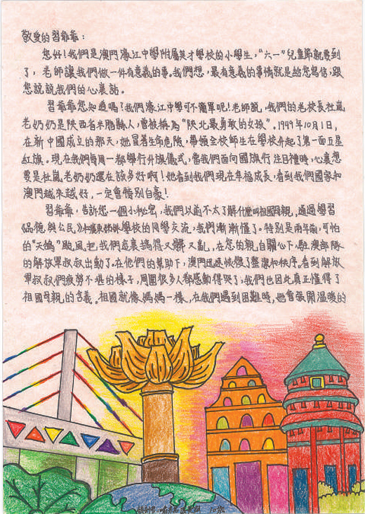 濠江中学创建于1932年,以爱国爱澳、为社会培育人才为办学宗旨,是澳门中小学生人数最多的学校。该校素有爱国主义传统,1949年10月1日新中国刚刚成立,时任校长杜岚就带领学校师生升起了第一面五星红旗。近日,濠江中学附属英才学校的小学生给习主席写信,讲述了他们对“祖国母亲”含义的理解,表达了长大后把祖国和澳门建设得更美好的决心。
