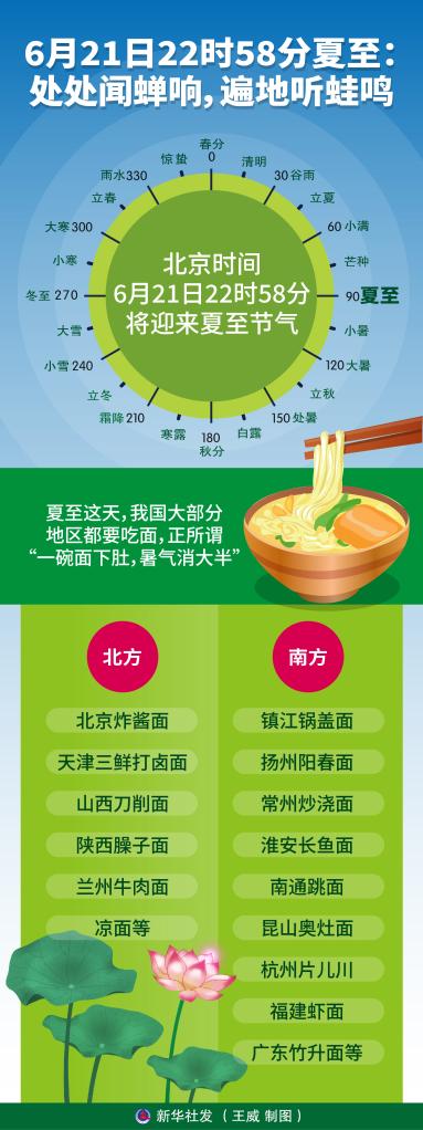 新华社天津6月20日电(记者周润健)“绿筠尚含粉,圆荷始散芳”。北京时间6月21日22时58分将迎来夏至节气,标志着蛙鸣阵阵、蝉吟声声、荷韵飘香的盛夏来临了。