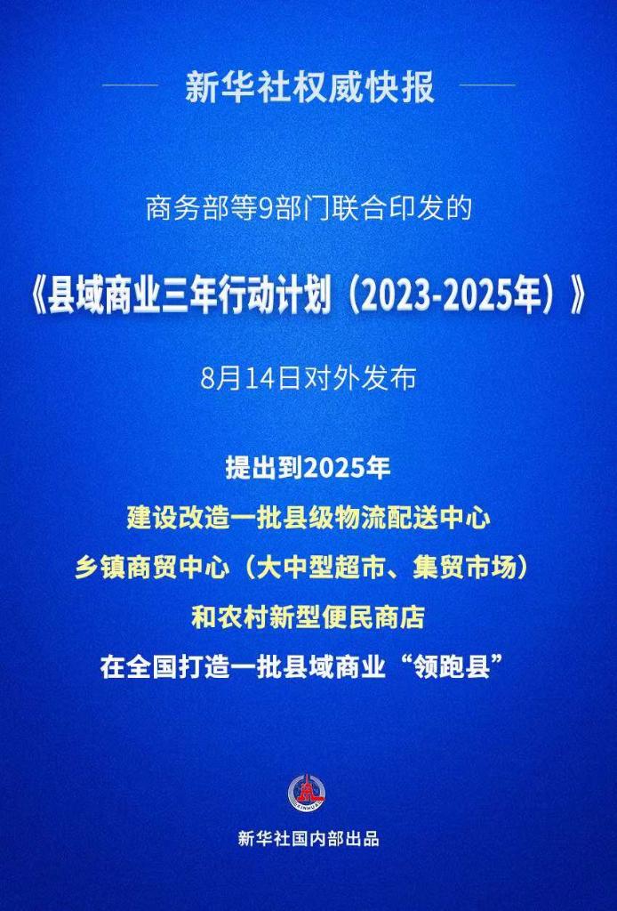 新华社北京8月14日电(记者潘洁、谢希瑶)商务部等9部门联合印发的《县域商业三年行动计划(2023-2025年)》14日对外发布。计划提出,到2025年,在全国打造一批县域商业“领跑县”,90%的县达到“基本型”及以上商业功能,具备条件的地区基本实现村村通快递。