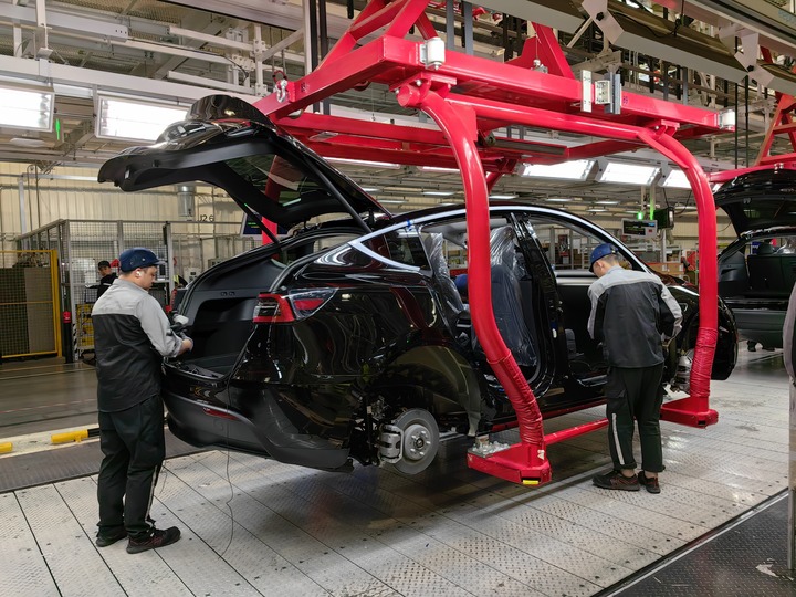 在特斯拉上海超级工厂,工人在车间内忙碌。新华社记者 周蕊 摄