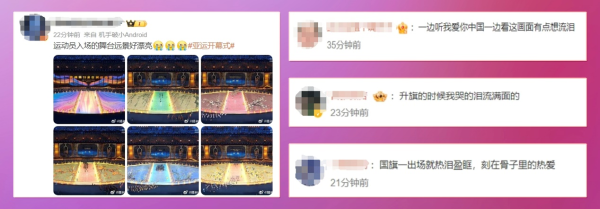 来自亚洲45个国家和地区代表团的运动员们在独特的中式“门窗”设计下依次出场亮相,伴随着“桂花鼓”和《我们的亚细亚》欢快的音乐,穿过梅兰竹菊桂荷等唯美景象,走上“花路”。网友大赞“你永远可以相信中国式浪漫”“BGM《我们的亚细亚》欢乐又魔性,在脑海中久久挥之不去”。