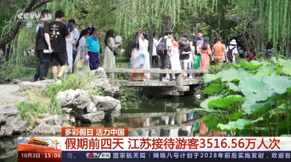 消费火爆、旅游火爆。记者从江苏省文化和旅游厅了解到,假期前四天,江苏全省共接待游客3516.56万人次。游客数量排名前三位的分别是南京、苏州和无锡。其中,A级旅游景区接待游客量排名前三的是,南京市夫子庙-秦淮风光带景区142万人次、南京市钟山风景名胜区-中山陵园风景区87万人次、苏州市平江历史街区78万人次。
