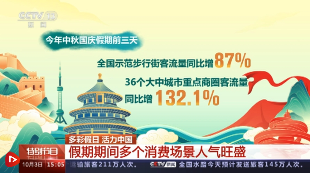 商务部数据显示,假期前三天,重点商圈人气红火。全国示范步行街客流量同比增长87%,36个大中城市重点商圈客流量同比增长132.1%。