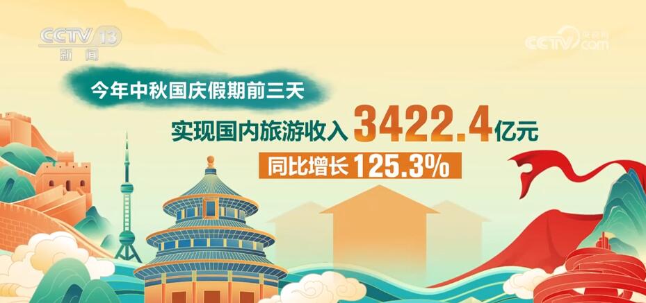 央视网消息:假日期间,旅游市场持续升温。来自文化和旅游部数据中心的消息,今年中秋国庆假期前三天,全国国内旅游出游合计3.95亿人次,同比增长75.8%,实现国内旅游收入3422.4亿元,同比增长125.3%。红色旅游城市和景区持续升温,自驾旅游、合家出游、休闲度假、乡村旅游,构成了假日旅游市场的“多样性+个性化”的主要特征。