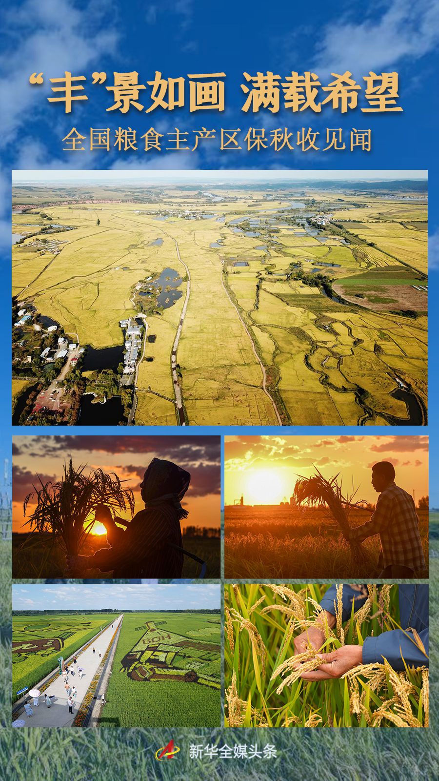 国庆期间,全国粮食主产区作物长势喜人、收割机驰骋,绘就多彩的丰收景象。