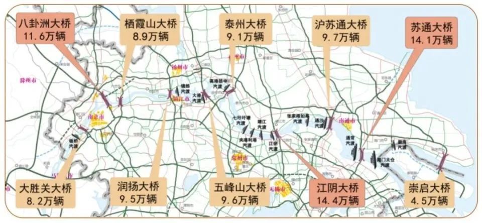 预计江苏全省部分高速路段高峰时段将会出现拥堵,主要为5个横向路段、6个纵向路段和3个过江通道。