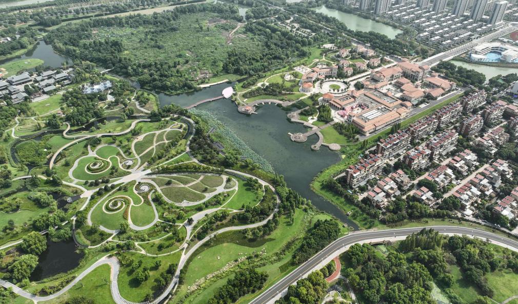 位于浙江省湖州市八里店镇的西山漾国家城市湿地公园和周边的居民区相互融合(无人机照片,2023年8月23日摄)。新华社记者 翁忻旸 摄
