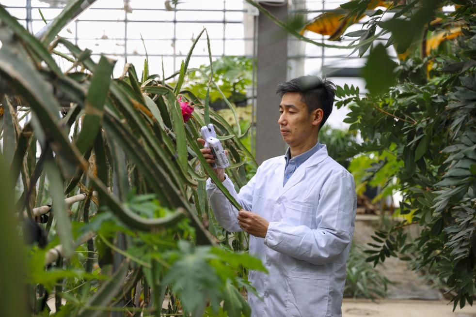 2024年1月2日,沈阳工学院生命工程学院教师在现代农业科技馆内检测火龙果叶片成分。新华社记者 杨青 摄