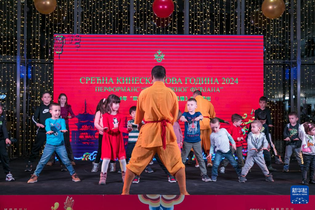 2月7日,在塞尔维亚首都贝尔格莱德,当地小朋友在活动上学习武术。新华社记者 石中玉 摄