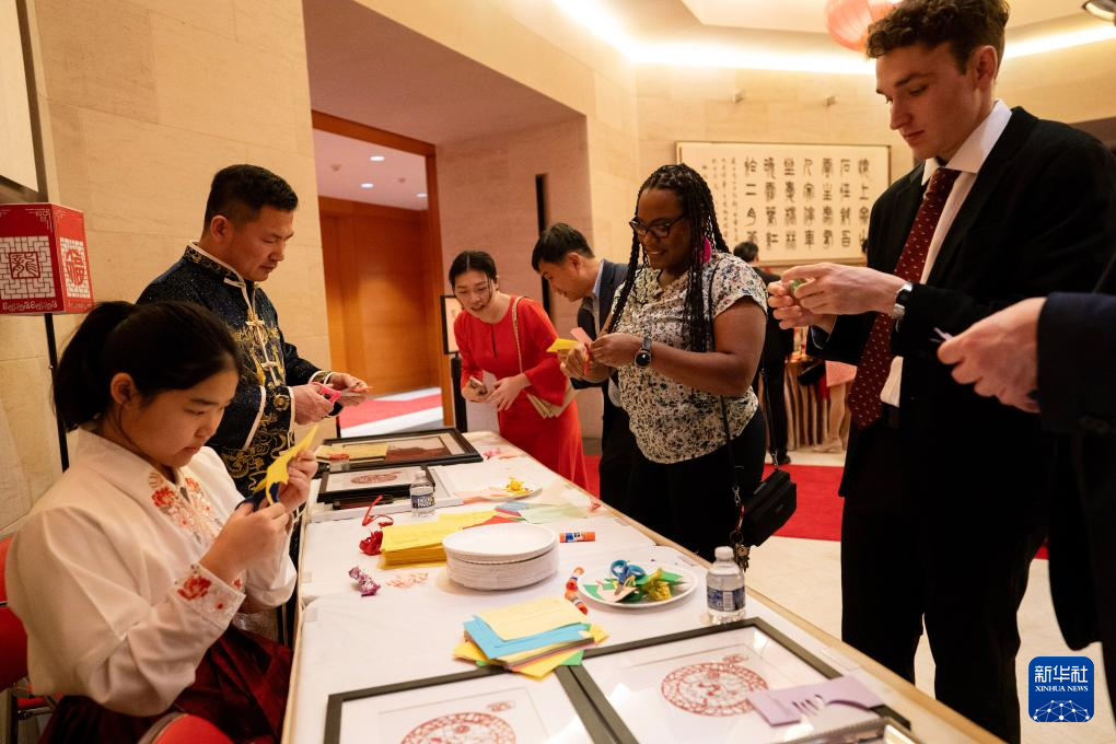 2月5日,在美国华盛顿的中国驻美国大使馆,工作人员在侨学界专场春节招待会上向来宾展示剪纸技艺。新华社记者 刘杰 摄