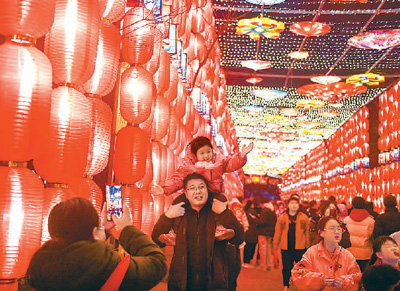 游客在河北省正定古城南城墙欣赏新春花灯。武志伟摄(人民图片)