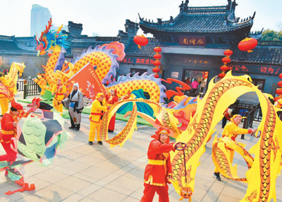 在江苏省如皋市水绘园风景区,彩带龙爱好者为游客表演舞龙。吴树建摄(人民图片)