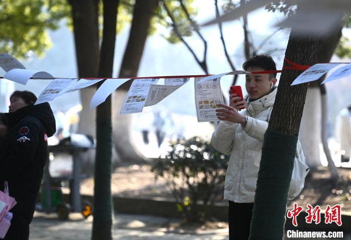 资料图:在合肥市大蜀山森林公园一处“相亲角”内悬挂的相亲简介吸引民众驻足。 韩苏原 摄