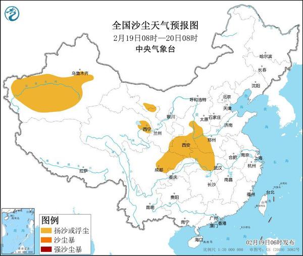 中央气象台2月19日6时继续发布沙尘暴蓝色预警:预计2月19日8时至20日8时,新疆南疆盆地、内蒙古西部、青海东北部、陕西中南部、山西西南部、河南西部、湖北中西部、四川盆地中北部等地的部分地区有扬沙或浮尘天气。