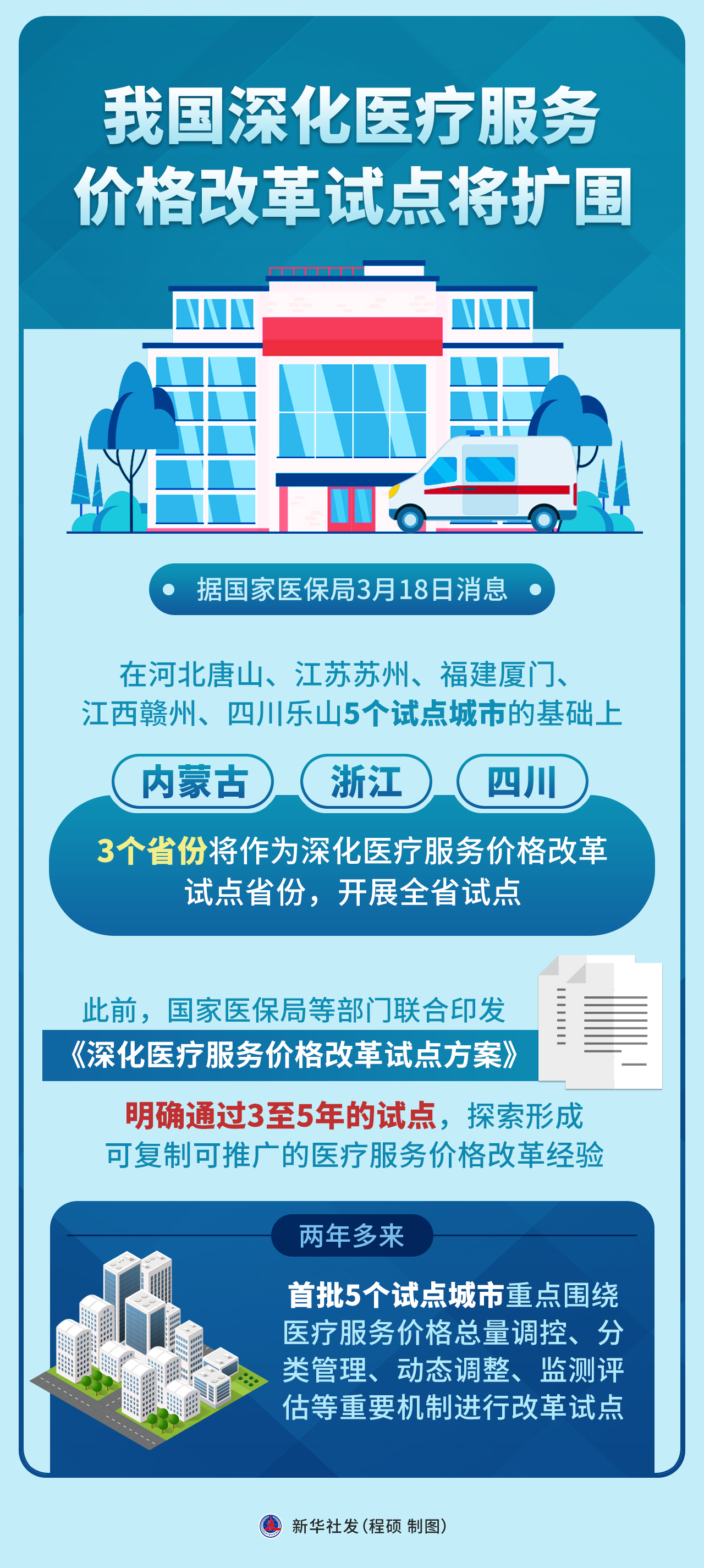 新华社北京3月18日电(记者彭韵佳)据国家医保局18日消息,在河北唐山、江苏苏州、福建厦门、江西赣州、四川乐山5个试点城市的基础上,内蒙古、浙江、四川3个省份将作为深化医疗服务价格改革试点省份,开展全省试点。