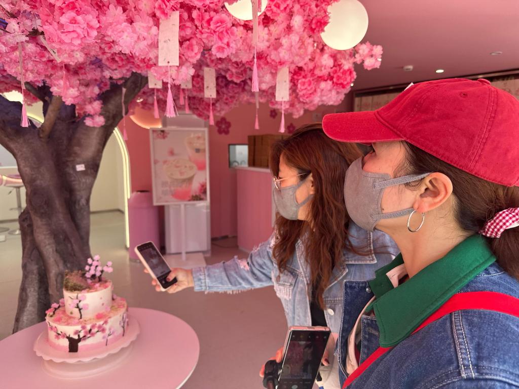 游客“打卡”北京市玉渊潭公园内的甜品店。新华社记者 杨淑君 摄