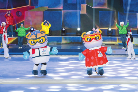 图为第九届亚洲冬季运动会吉祥物“滨滨”(前左)、“妮妮”(前右)在活动现场表演。