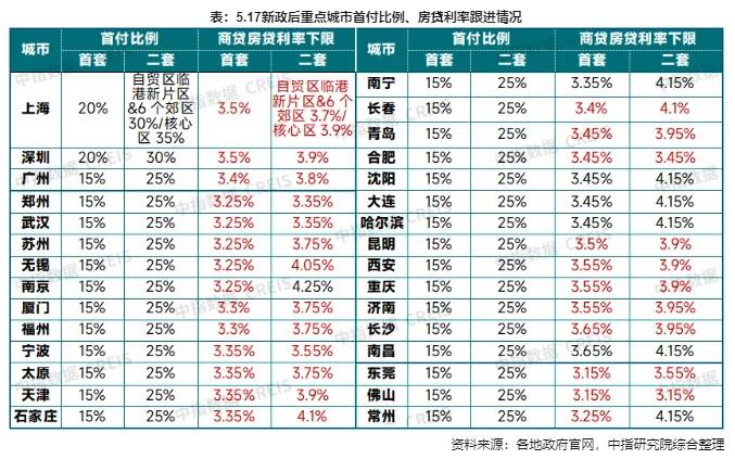 广州的购房首付比则调整为首套房15%、二套房25%,并成为当前一线城市中唯一取消房贷利率下限的城市。5月28日,广州主要银行就房贷利率达成共识,首套房利率3.4%,二套房利率3.8%。