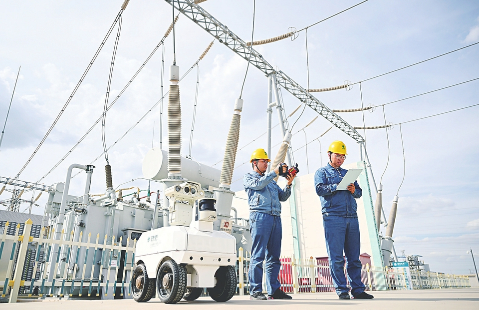 图为6月27日,国网银川供电公司变电运维中心员工在甘露330千伏变电站开展“人机联合”巡检。新华社记者王鹏摄