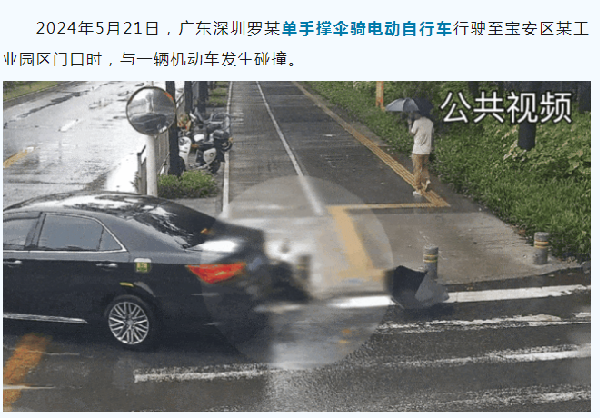 2024年5月21日,广东深圳罗某单手撑伞骑电动自行车行驶至宝安区某工业园区门口时,与一辆机动车发生碰撞。