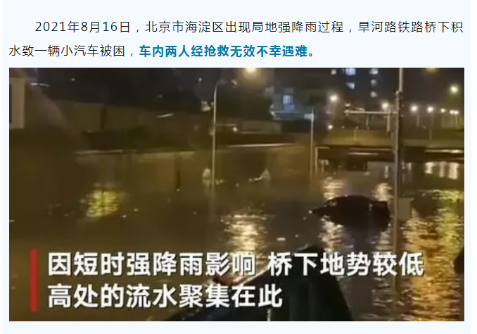 2021年8月16日,北京市海淀区出现局地强降雨过程,旱河路铁路桥下积水致一辆小汽车被困,车内两人经抢救无效不幸遇难。