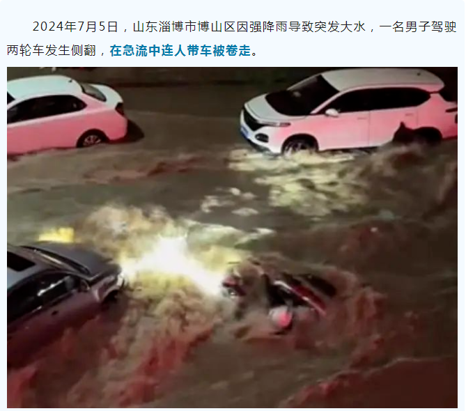 2024年7月5日,山东淄博市博山区因强降雨导致突发大水,一名男子驾驶两轮车发生侧翻,在急流中连人带车被卷走。
