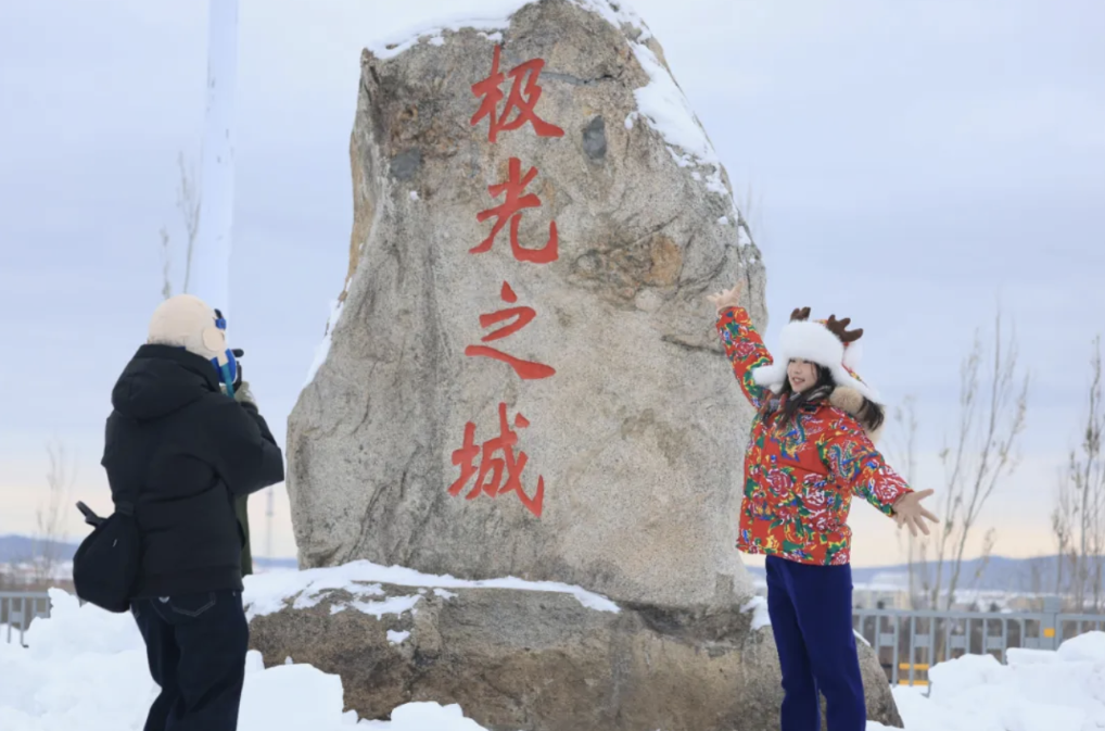 游客在漠河站站前广场与“极光之城”碑打卡。新华社发(徐率摄)