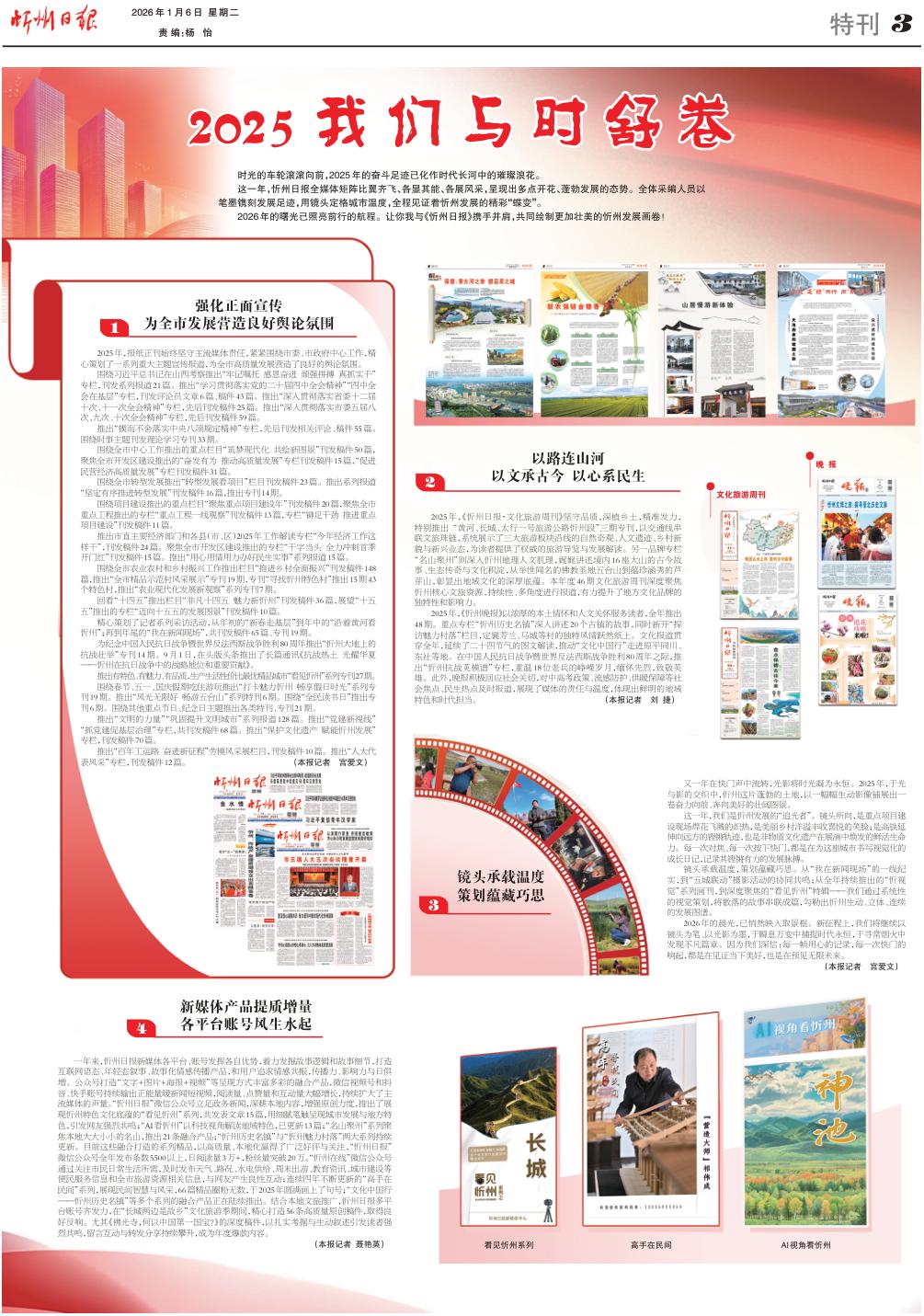 2025年,《忻州晚报》以浓厚的本土情怀和人文关怀服务读者,全年推出48期。重点专栏“忻州历史名镇”深入讲述20个古镇的故事,同时新开“探访魅力村落”栏目,定襄芳兰、马城等村的独特风情跃然纸上。文化报道贯穿全年,延续了二十四节气的图文解读,推动“文化中国行”走进原平同川、东社等地。在中国人民抗日战争暨世界反法西斯战争胜利80周年之际,推出“忻州抗战英模谱”专栏,重温18位老兵的峥嵘岁月,缅怀先烈,致敬英雄。此外,晚报积极回应社会关切,对中高考政策、流感防护、供暖保障等社会焦点、民生热点及时报道,展现了媒体的责任与温度,体现出鲜明的地域特色和时代担当。(本报记者刘捷)